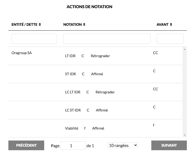 • Les notes VR et IDR pourraient être revalorisées si Oragroup bénéficie d’un apport de capital d’urgence, permettant ainsi de renforcer la capitalisation et de rééquilibrer sa liquidité.