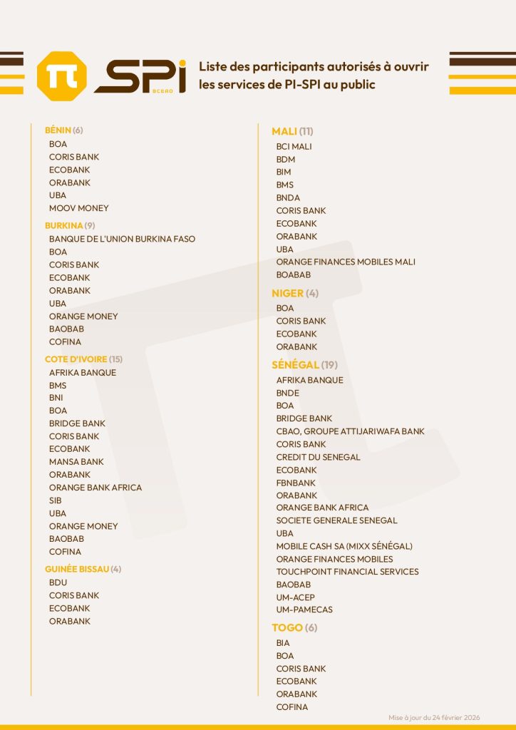 Le système de paiement instantané PI-SPI, lancé le 30 septembre 2025 par la Banque centrale des États de l’Afrique de l’Ouest (BCEAO), continue de gagner du terrain dans l’Union économique et monétaire ouest-africaine. La liste des institutions autorisées à proposer ces services au public est passée de 62 à 74 établissements, marquant une étape importante dans la transformation des paiements numériques dans la région.